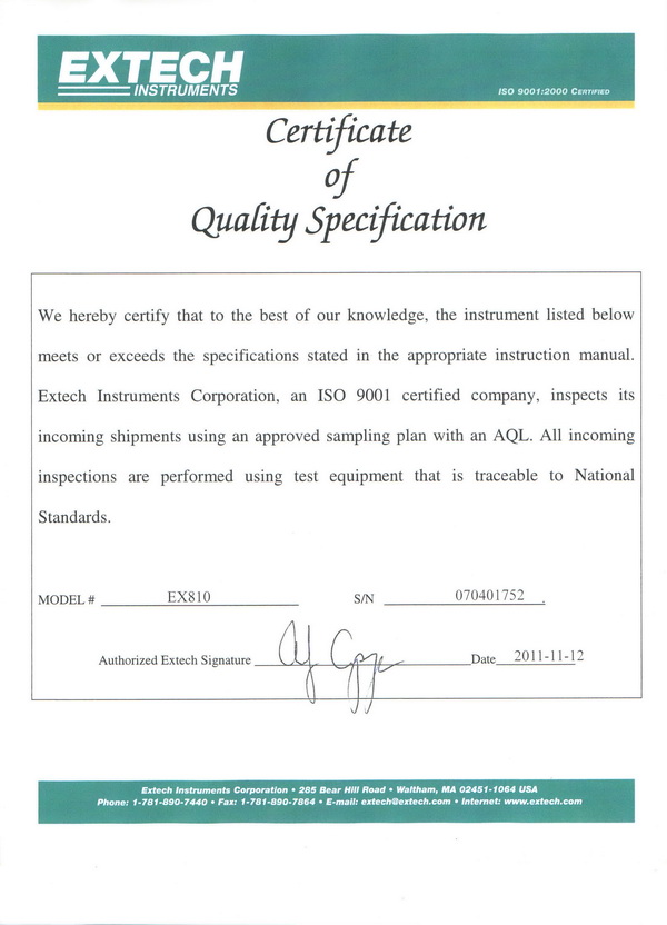 美国EXTECH公司偕同上海贝汉公司声明如下 现已有不少用户反应,市场上出现买到的EXTECH仪器质量甚差,既没有“产品质量证明”,也没有“中文使用手册”。为此,请发现此类现象的用户电邮告知本公司,并坚决退回售卖单位。 另:凡非本公司售出或非本公司经销商售出的产品,一律不享受产品质量保修。所有保修或维修,须出具在本公司备案的“产品序列号” 以下是EXTECH公司出具的“产品质量证明”